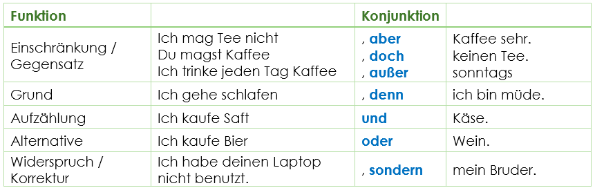 Подчинительные союзы: „dass“, „weil/da“, „obwohl“, „damit“, „wenn/falls“, „so dass“, „indem“ и „als/wenn“.